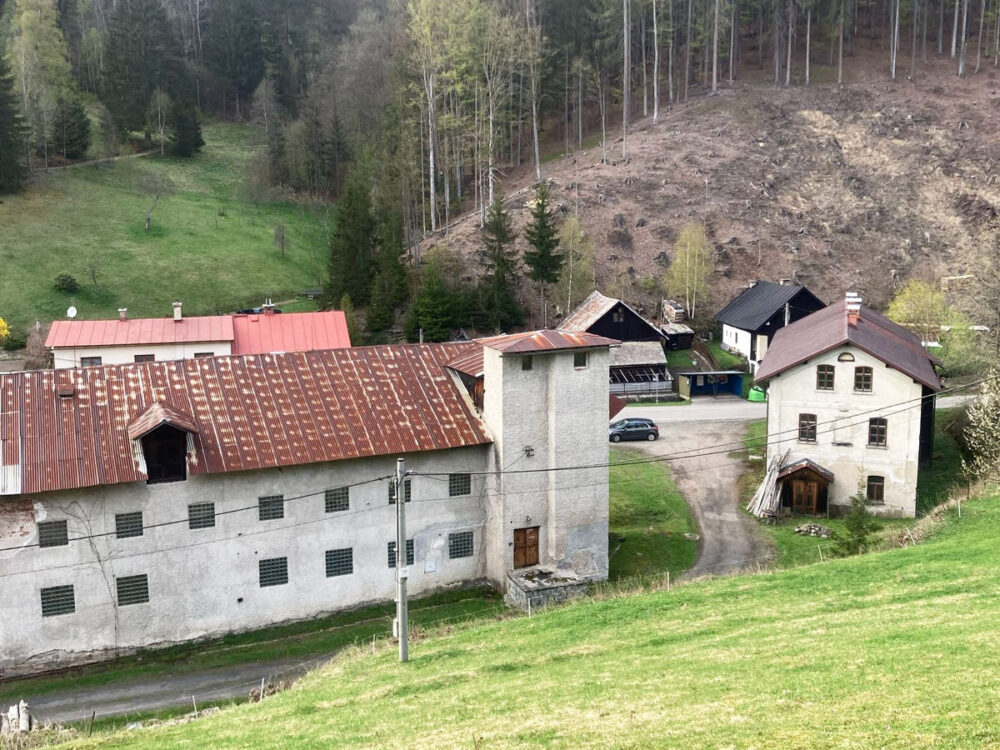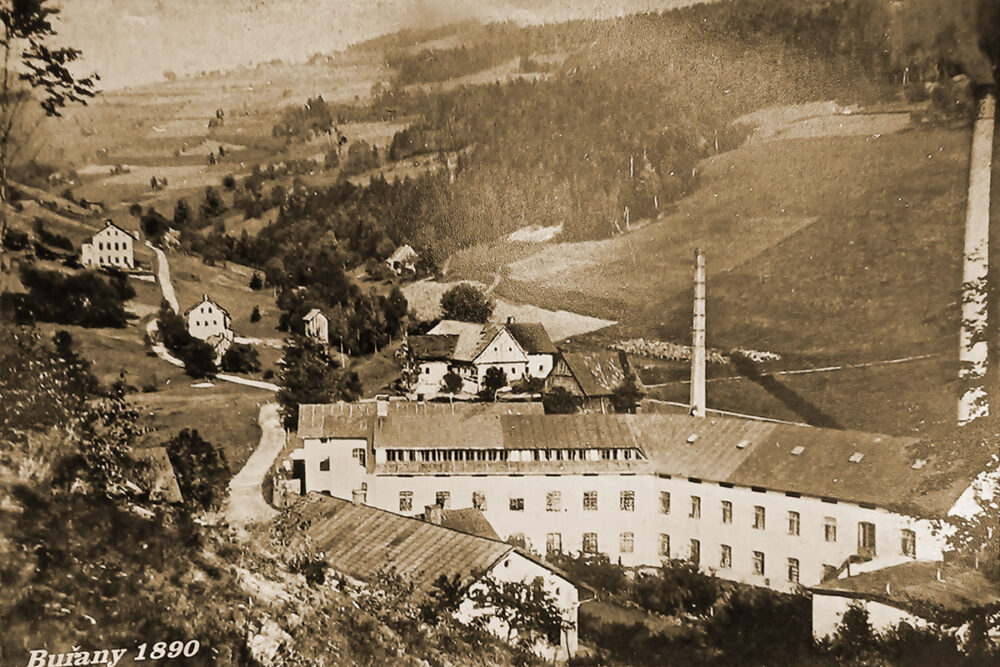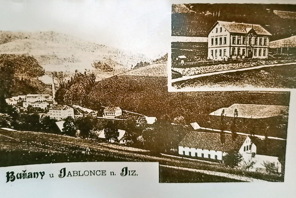 Obrázek 1a, b. Pro příběh a prostředí povídky Jumr se vrátil (soubor Zátiší) našel autor pravděpodobně inspiraci v Buřanech, podkrkonošské vesnici u Jablonce nad Jizerou, kde si jeho bratr Arnošt zakoupil v první půlce 90. let 19. století tkalcovskou továrnu a několik let v ní podnikal. Obrázek 1a ukazuje celý komplex v roce 1890, na obrázku 1b je vidět také místní škola.
