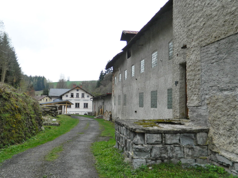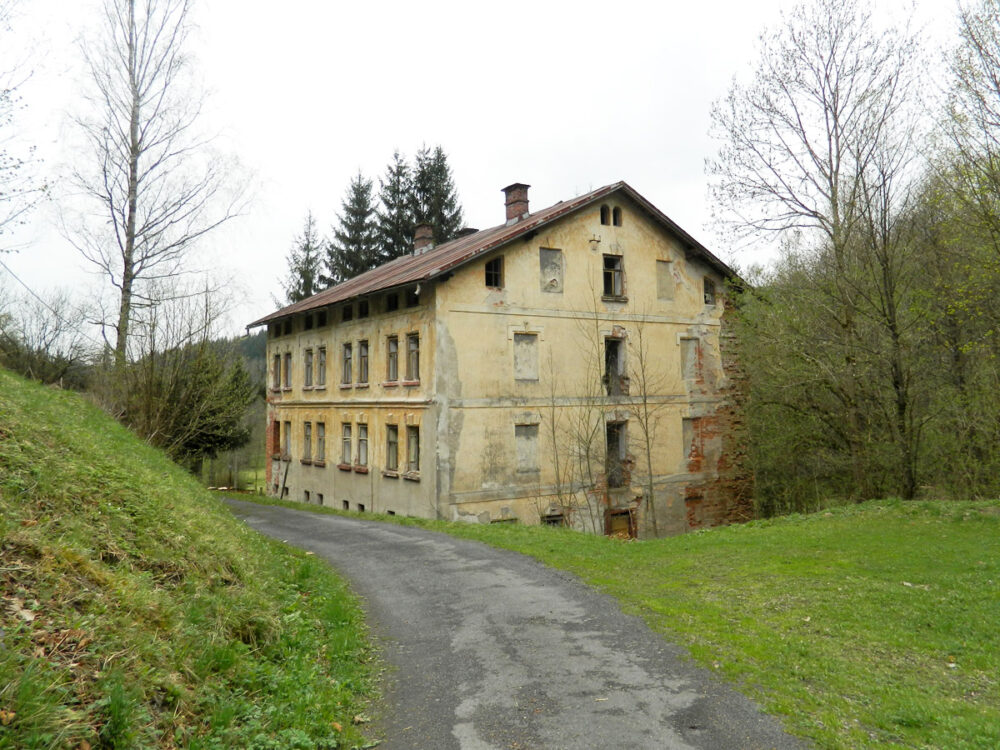 Obrázek 3a, b. Obrázek 3a zobrazuje začátek cesty „Šlejharky“ podél zadního traktu továrny. Na obrázku 3b je pravděpodobně vila majitele továrny, dnes opravená a obývaná (foto Z. Beran).