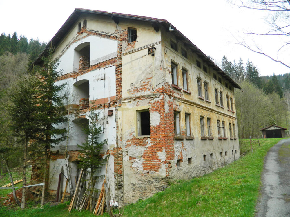 Obrázek 4a, b. Budova dělnické ubytovny, kterou nechal postavit Arnošt Šlejhar. I když zbývá pouhé torzo, dům do detailu odpovídá Šlejharovu popisu „kvartýrhausu“ (foto Z. Beran).