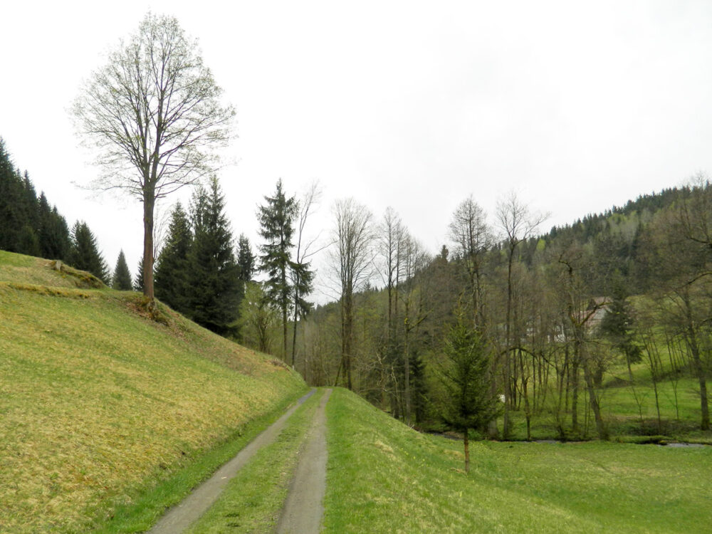 Obrázek 5 a, b. Cesta „Šlejharka“. Podle vyprávění místních nechal Arnošt Šlejhar tuto povlovnou cestu podél potoka zbudovat jako alternativu k silnici, která ve svahu na druhé straně potoka výrazně stoupá a klesá. V zimě měly koňské povozy problém silnici zvládnout a „Šlejharka“ tak značně zjednodušila zásobování továrny (foto Z. Beran).